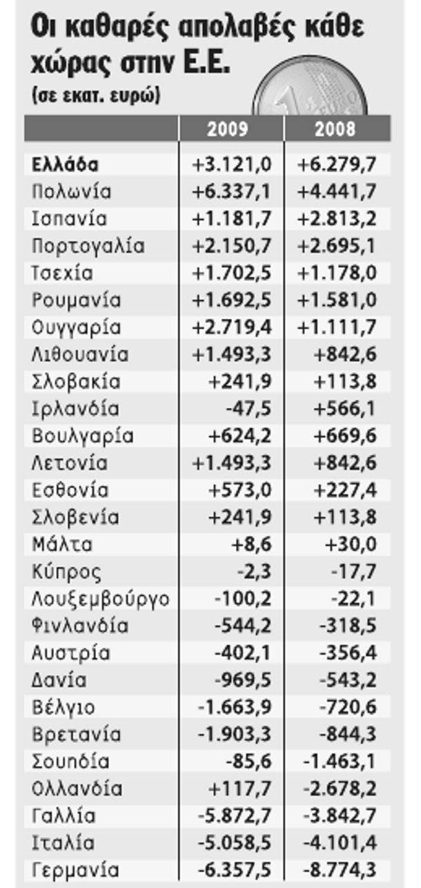 Oπως προκύπτει από τα κοινοτικά στοιχεία σχετικά με τις καθαρές απολαβές των κρατών-μελών το 2009, η Ελλάδα εισέπραξε το έτος αυτό το ποσό των 3,121 δισ. ευρώ μετά την αφαίρεση της συνεισφοράς στους ιδίους πόρους της Ε.Ε. Το 2008 οι απολαβές της χώρας ανήλθαν σε 6,279 δισ. ευρώ.